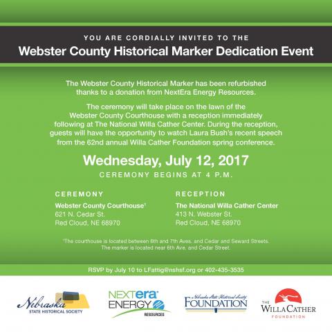 The ceremony will take place on the lawn of the Webster County Courthouse with a reception immediately following at The National Willa Cather Center. During the reception guests will have the opportunity to watch former First Lady Laura Bush's recent speech from the 62nd annual Willa Cather Spring Conference and National Willa Cather Center Dedication Event.
