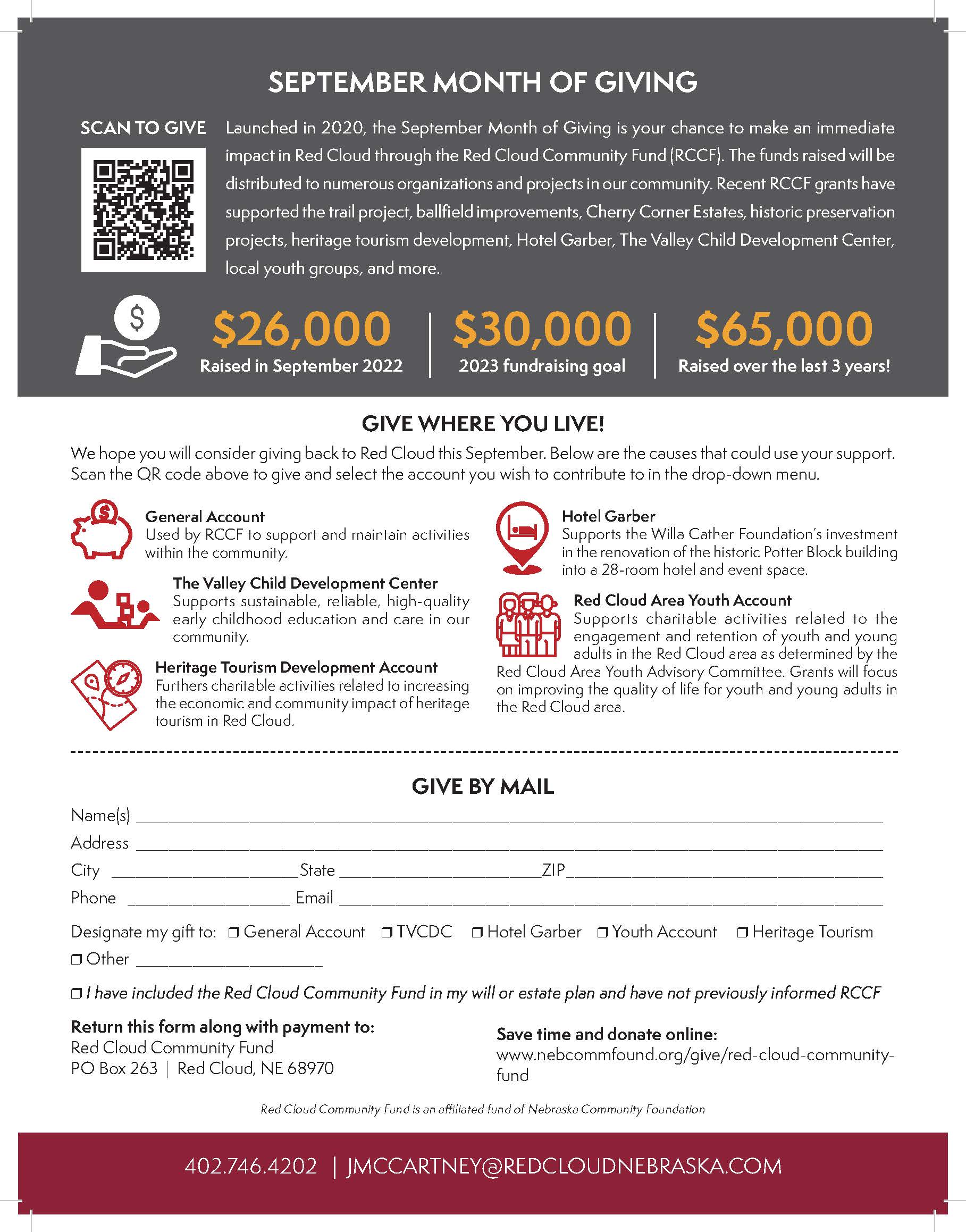 RED CLOUD--Launched in 2020, the September Month of Giving is a time of focused fundraising for the Red Cloud Community Fund (RCCF). Money raised during this time will be granted to eligible entities to address community needs before the end of the calendar year. RCCF has raised more than $65K over the last 3 Septembers, establishing a new record of $26,406 during September 2022. This year's fundraising goal is $30,000!